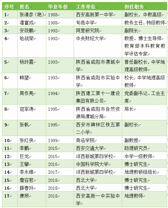 地理科学专业旨在培养服务陕西省,掌握现代教育理论、地理学科教学理论的基础教育团队。在师范生培养过程中一贯坚持养成教育的优良传统,秉持“厚德博学”的校训和“学高为师、身正为范”的育人理念,为基础教育培养了大批人才。对近十年师范毕业生的跟踪调查显示:地理科学专业毕业生累计达到900余人,攻读硕士、博士研究生约占15.81%;从事基础地理教育占78.29%,其他行业占6.76%。毕业生在陕西省内从事基础教育的占比约为70%。用人单位对毕业生的满意度达96%以上。有45%的毕业生已成为中小学优秀教师、教学能手、领导干部或业务骨干。