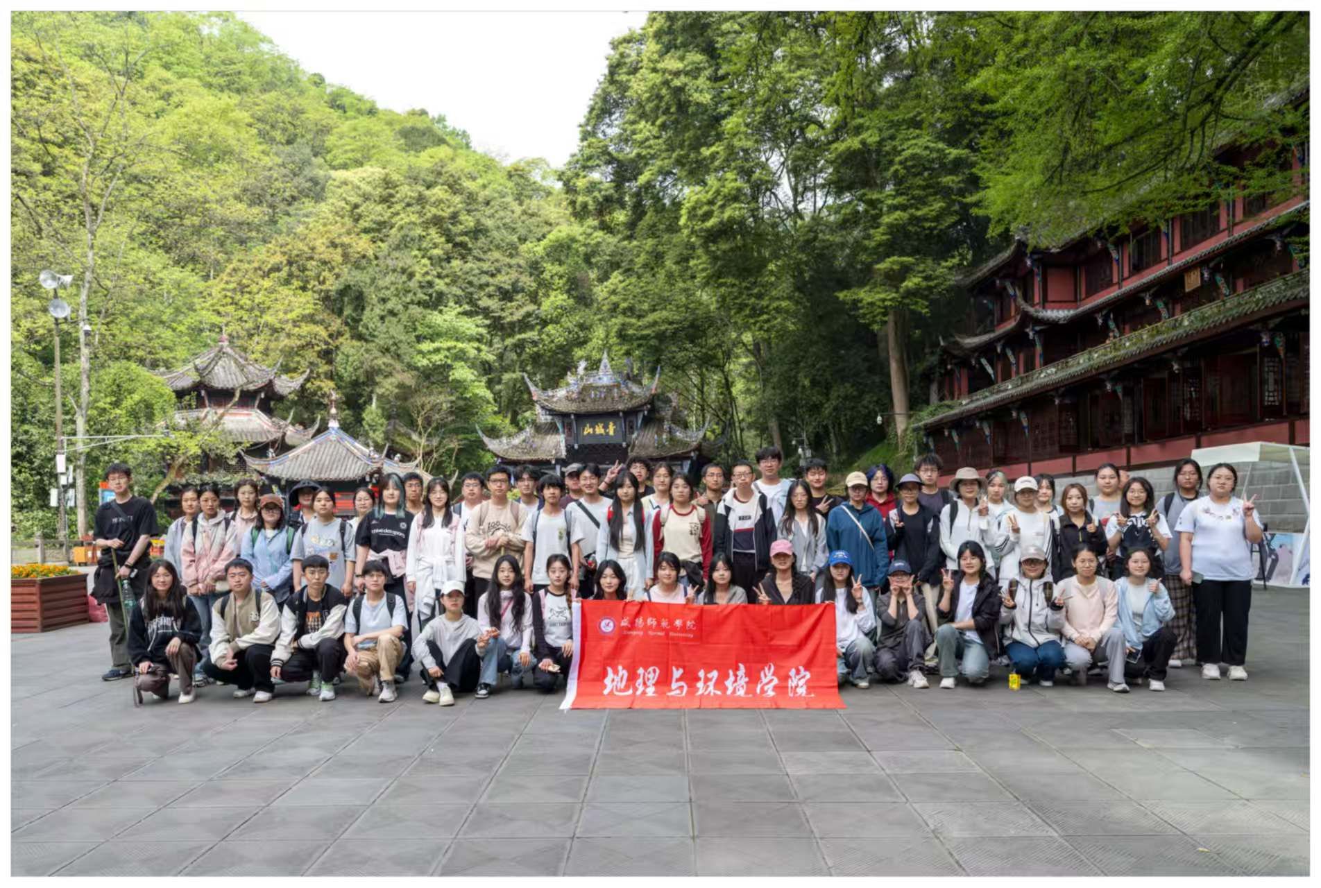 在青城山实习点,实习师生对青城山的地质构造、地貌形态、水文环境、土壤类型和植被群落进行了实地考察,将课堂上学到的地质学、地貌学、气象学、水文学、土壤学和植物学等自然地理知识,与实地观察相结合,实现了知识的融会贯通与深化理解。